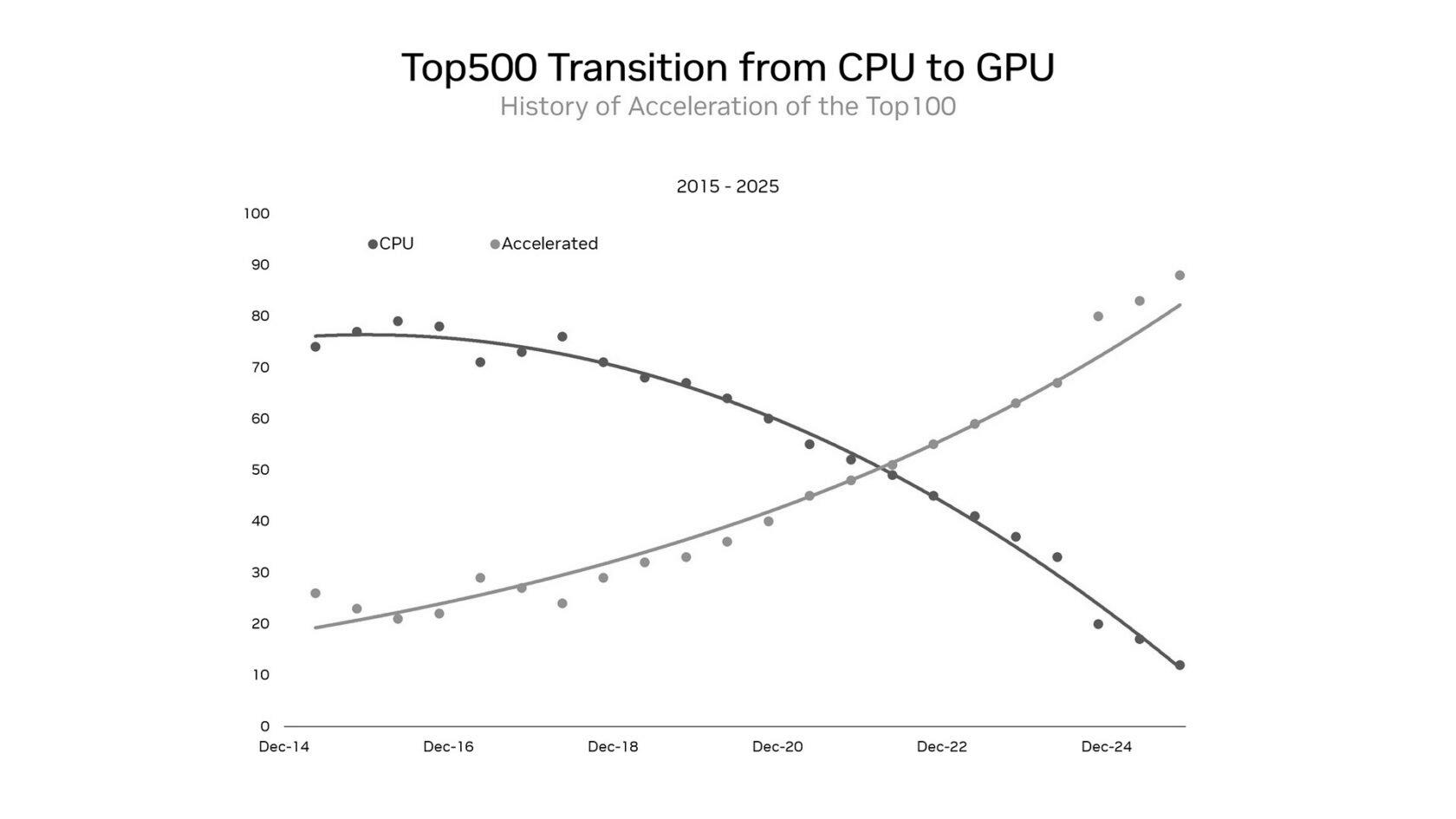 At SC25, NVIDIA founder and CEO Jensen Huang highlighted the shifting landscape. Within the TOP100, a subset of the TOP500 list of supercomputers, over 85% of systems use GPUs. This flip represents a historic transition from the serial‑processing paradigm of CPUs to massively parallel accelerated architectures.