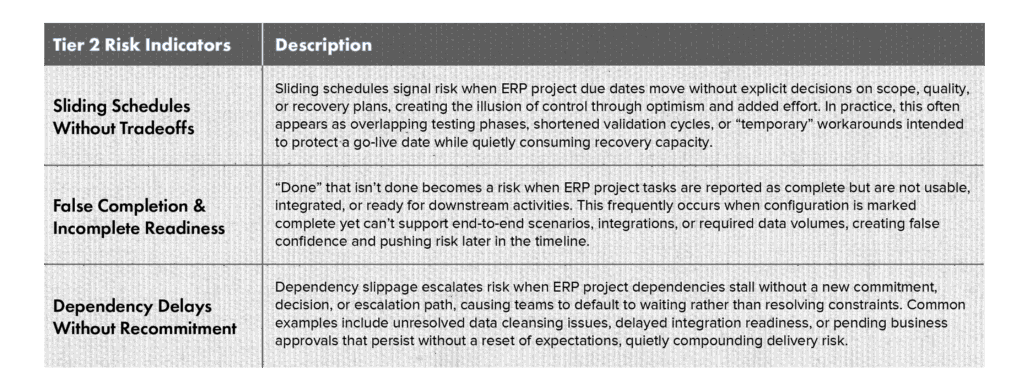 Leaders who rely solely on formal reporting and project calendars are often late to recognize and respond to risk during an ERP implementation. Effective organizations are those that pay attention to behavioral and structural indicators before schedules slip, integrations fail, or downstream testing degrades.