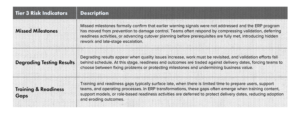 Clarkston recommends a tiered risk framework based on observed warning signs across ERP programs. The tiers reflect patterns commonly seen in ERP implementations that later experience delivery challenges, while the examples and guidance draw from practical ERP project leadership experience. Together, they provide a clear, actionable perspective on how ERP risk develops and how it can be identified early, before it appears in formal status reporting.