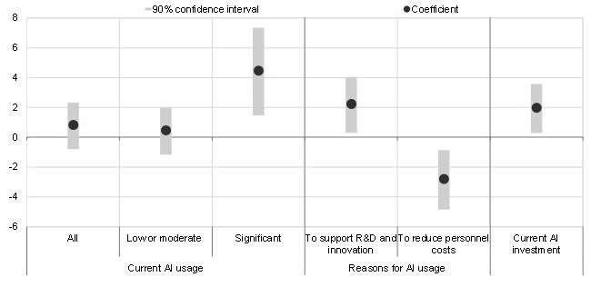 Source: SAFE. Notes: Chart 2 shows the marginal effect of the b coefficient from an ordered probit of the outcome “increase” in employment (see footnote 1 for more details on the regression). Columns 4 and 5 are the coefficients of dummies taking the value 1 if the firm declared the reason for using AI. Cross-sectional dataset of around 5,300 euro area firms. Observations for current AI investment: second quarter of 2025. Observations for current AI use: fourth quarter of 2025.