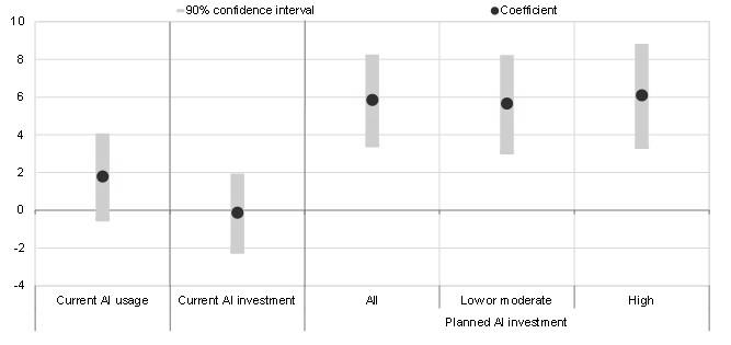 Source: SAFE. Notes: Chart 3 shows the marginal effect of the b coefficient from an ordered probit of the outcome “increase” in employment expectations. The control variables are the same as in Chart 2, with planned AI investment included in addition to AI usage. Expectations refer to the next year. Cross-sectional dataset of around 5,300 euro area firms. Observations for current AI investment: second quarter of 2025. Observations for AI use and future AI investment: fourth quarter of 2025.