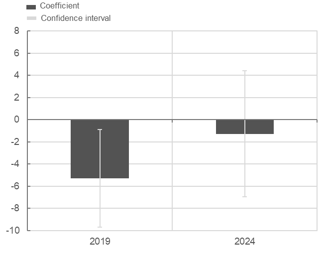 Sources: AnaCredit and own calculations. Notes: The chart reports the coefficients of a regression of loan growth on firm-size dummies and other controls for micro-sized companies compared with loan growth to large companies. The base dummy is represented by large firms. To assess if credit growth improved over time, two regressions are estimated, one for 2018/19 and one for 2023/24. The AnaCredit dataset employed in the analysis relates to loan-level data from 38 Greek banks’ lending to approximately 38,000 firms, aggregated at the bank-firm level. Firms were classified by size following the EU standard classification of companies. Regressions incorporate bank, industry and location fixed effects, with confidence intervals reported at the 95% level.