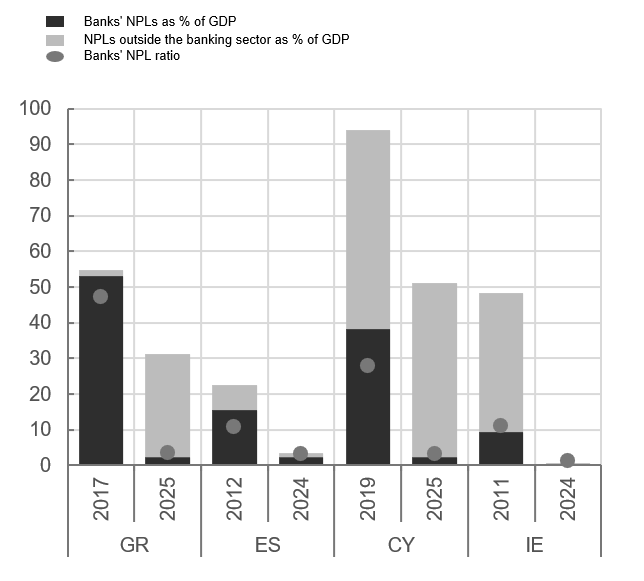 Sources: BoG, CBC, BdE and CBI, ECB, Nama. Notes: The first date for each country corresponds to the first year when NPLs started being transferred outside the banking sector. NPLs outside the banking sector are held by Nama in Ireland, Kedipes in Cyprus, Sareb in Spain, and various loan servicing companies in Greece. Data for Portugal are unavailable. For Ireland, GNI* is used instead of GDP. For 2025, data for Greece and Cyprus refer to September and December, respectively. For Ireland and Spain, data for 2025 for NPLs in Nama and Sareb were not yet available when this blog was published.