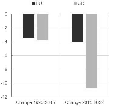 Sources: OECD TiVA 2025 and ECB calculations. Note: The chart is based on a gravity equation estimated as in Bernasconi et al. (2025) and shows the change in intra-EU trade barriers for the EU and Greece.