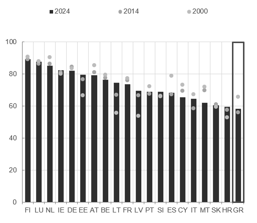 To unlock growth potential and support the catching-up progress, Greece can benefit from policies and reforms that further strengthen competitiveness, investment and innovation. Greece has implemented major reforms to open up labour and product markets and boost competition. More flexible work arrangements, digitalised public services and streamlined business procedures, the Hellenic Cadastre, are some of the key achievements that have helped bring unemployment to record lows and attract investment. But the job isn’t finished. Stronger upskilling and reskilling opportunities, together with expanded childcare access to boost women’s workforce participation, can ease the strain of an ageing population. And as digital technologies, including AI, become central to economic performance, creating the right incentives for innovation and technology adoption is increasingly essential.