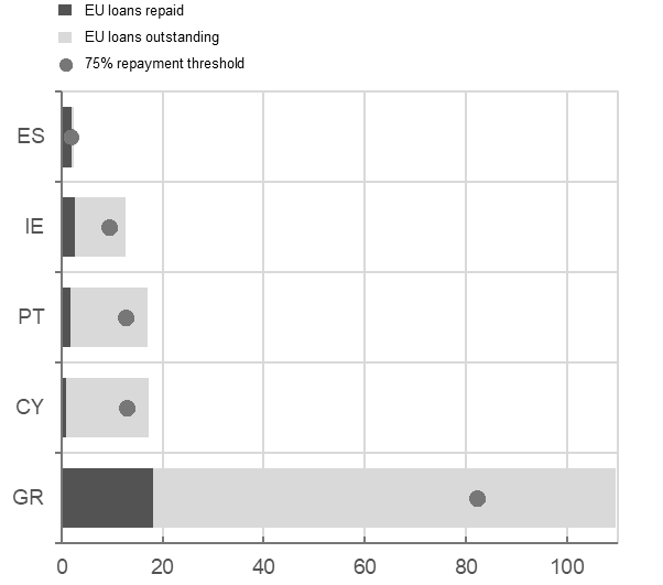 Sources: ESM, European Commission. Notes: Spain is the only country that has by now surpassed the 75% repayment threshold. For Ireland, GNI* is used instead of GDP.