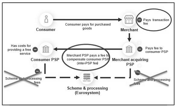 Note: the scheme and processing fees (crossed out with a pink cross) are the difference between the compensation model in a four-party scheme (where they are included) and the digital euro compensation model (where they are not included).