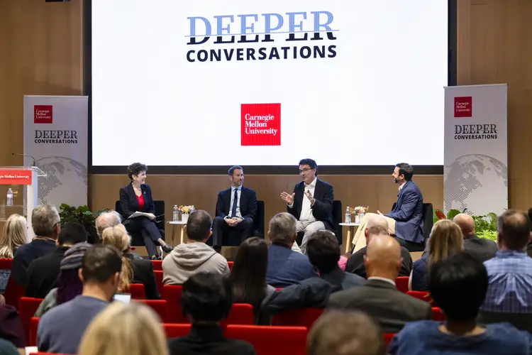 Monday’s lecture was followed by an on-stage discussion facilitated by Dean of Students and Vice President for Student Affairs Gina Casalegno(opens in new window). She was joined by Lee and Chang, along with dinner participants and current CMU students Stephen Sudia and Anna Sène, who recounted their one-on-one interactions from the previous evening.