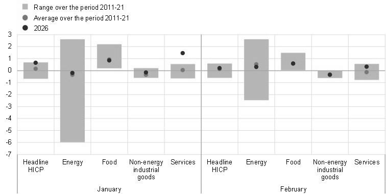 Sources: Eurostat and authors’ calculations. Notes: The blue dots indicate the month-on-month percentage change in headline HICP and its components in January and February 2026. The red dots indicate the average month-on-month percentage change in January and February over the period 2011-21. The yellow bars indicate the minimum-maximum range of month-on-month percentage changes in January and February over the period 2011-21.