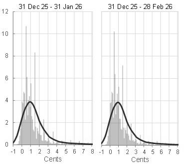 (panel a: y-axis: density, x-axis: euro cents; panel b: percentages)