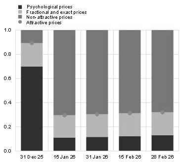 Consistent with this finding, the proportion of “attractive” prices – i.e. prices with endings that sellers believe to be appealing to consumers, such as €0.99 – declined markedly following the euro changeover. This reflects the mechanical conversion of lev prices into euro (Chart 2, panel b). Since then, this share has gradually increased, suggesting that retailers are progressively realigning prices towards commonly used price endings. Again, evidence from earlier euro changeovers indicates that such adjustments typically take place over time. They occur often in the context of regular price revisions and cost developments, rather than as a direct consequence of the changeover itself. And the same seems to be the case for Bulgaria. This also suggests that retailers did not systematically raise prices when the euro was introduced.