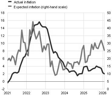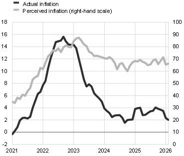 Notes: Inflation perceptions and expectations obtained from the European Commission’s consumer survey. The indicators are based on the share of respondents reporting price increases (for perceived inflation) and expecting prices to increase (for expected inflation). Perceived inflation is based on replies to the question: “How do you think that consumer prices have developed over the last 12 months? They have: (a) risen a lot; (b) risen moderately; (c) risen slightly; (d) stayed about the same; (e) fallen”. Respondents may also respond “don’t know”. Expected inflation is based on replies to the question: “By comparison with the past 12 months, how do you expect that consumer prices will develop in the next 12 months? They will: (a) increase more rapidly; (b) increase at the same rate; (c) increase at a slower rate; (d) stay about the same; (e) fall.” Respondents may also respond “don’t know”. The latest observations are for February 2026.