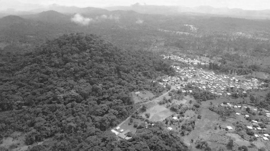 Drone view of the chimpanzee habitat at Bossou. The original outdoor laboratory (called “Bureau”) is located at the top of the hill.